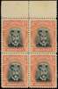 4d Head Die IIIB, perf 14, toned paper. Upper marginal block of four in black and orange-red (pale), lower left stamp with position 17 ‘chopsticks’ flaw. O.g., with the stamps unmounted; scarce. SG 262 group, AH 10