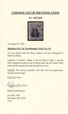 6d Head Die IIIB, perf 14, toned paper. Used example with neat part Gatooma CDS, with the characteristics of early Plate 8 and frame in ‘rich plum’, the “mystery stamp” with scratch in cap. Hensman Certificate (2020), ex Spivack. SG 266 group, AH 21 var