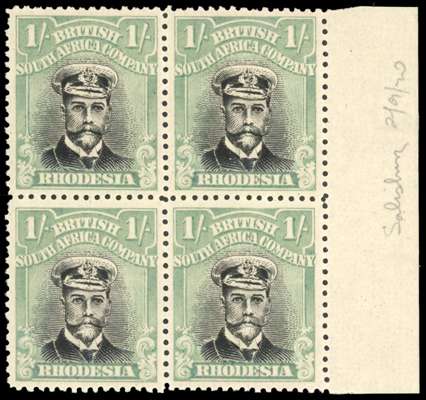 Rhodesia 1/- SG 272b block mint, fine provenance