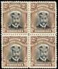 2/- Head Die I, perf 14. Fresh block of four, large part o.g. with the lower pair unmounted, positions 27-38, showing printer's mark. An interesting multiple with all four stamps showing hand-painting to left of the cap, encroaching onto the cap on three positions; also with signs of frame re-entries, notably on the lower left stamp with a distinct line above the left value. Ex Wilson (Lot 2094, where it was misdescribed as perf 15). SG 214