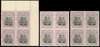 6d Head Die I, perf 15. Three blocks of four in differing shades of black and mauve. One from the top right corner, stamps unmounted o.g., the lower right stamp with a crease; the others large part o.g., one with the lower pair unmounted. SG 217