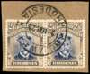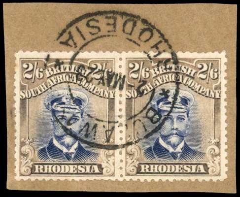 2/6d Head Die IIIB, perf 14, white paper. Horizontal pair used on piece with Bulawayo CDS of 2 MAY 23. SG 302, AH 12