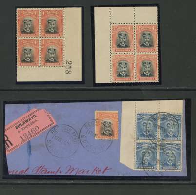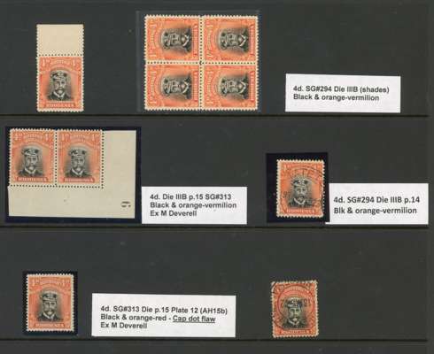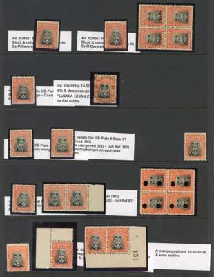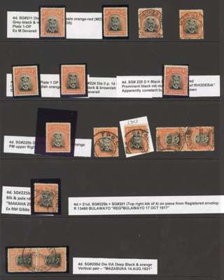 4d balance group on three Hagners. Mint with SG 211 x 3, 224, 225, 225b (printer's mark), and some nice used. The rest all Head Die IIIB. Toned paper with three mint blocks, seven singles and a pair, shades; with SG 262 used with Concession Rail DC. White paper with SG 294 printer's file block, mint with three singles unmounted, pair, block of four ex Wilson with two unmounted, and used with Matete DC; SG 313 sheet number pair mint with one unmounted, and a single mint with cap dot flaw