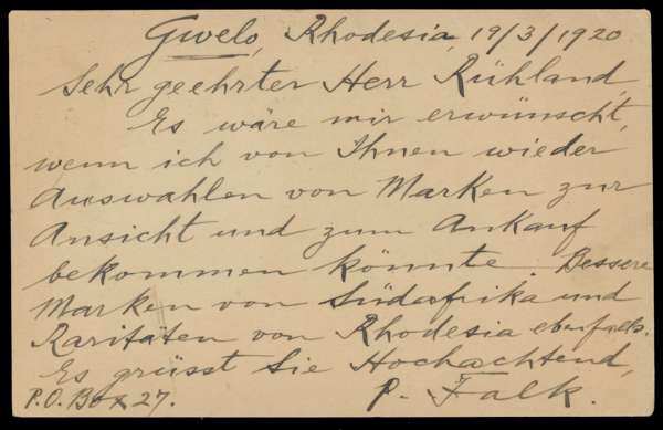 Postal Stationery. 1920 ½d postal stationery card to Germany, uprated with ½d Admiral, Gwelo CDSs 26 MAR. Upper left corner slightly creased, otherwise fine
