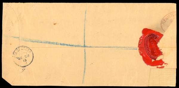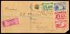 1913 registered envelope (opened out and reduced, now 8 x 3¾") to England. Bears 1d and 2½d Falls, ½d and 1d Double Heads and 3d Admiral Die I. Tied by seven strikes of the Regd Bulawayo skeleton CDA of DE 3. Attractive, despite the reduction