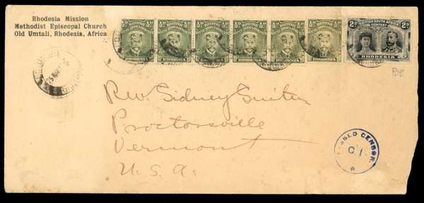 ½d strip of five and single with Double Head 2d perf 15 on 9 x 4" Mission envelope (printed legend at top left) to Vermont, with mostly indistinct Old Umtali CDSs of 25 MAY 1916. Blue circular PASSED CENSOR C.1 on front, reverse with Umtali transit. Small faults but a good franking on a Mission cover