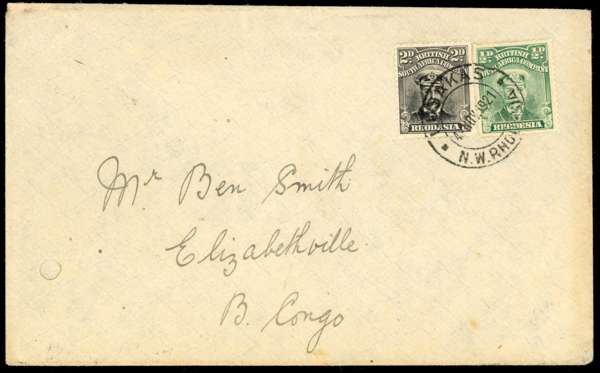 1921 envelope to Elizabethville with ½d and 2d Admirals, Lusakas CDS of 4 NOV 1921. Punched hle at left, minor staining. Broken Hill transit on reverse; a bit roughly opened
