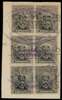 2d Head Die II, perf 14. Three horizontal pairs on Revenue document piece, each stamp perfined 30 11 15 (upright or sideways), indistinct violet oval cancels. The lower left stamp has a stronger and darker impression than the others. SG 220