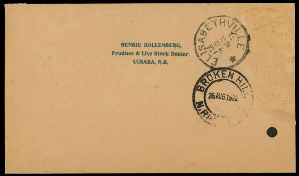 1922 envelope to Elizabethville bearing Admiral 3d with Lusakas CDS 25 AUG 1922 (Proud D2 State 1, with dented rim). Faults to the envelope, including punch hole at lower left