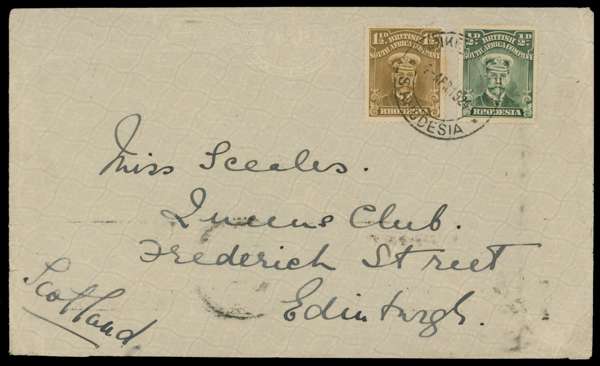 1924 envelope to Edinburgh with Admiral ½d and 1½d, Banket Junction CDS of 4 APR (Southern Rhodesia stamps were issued on 1st April; Rhodesia stamps remained valid for a month). Salisbury slogan roller on reverse (roughly opened, not affecting appearance from the front)