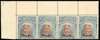 3/- Head Die II, perf 14. Horizontal strip of four from the upper left corner, in chocolate and deep turquoise-blue, o.g., lightly hinged on the selvedge only. The vignette is low, leading to hand-painted retouching above the cap on all four stamps. A fine and attractive multiple. SG 236b, AH 4(A)