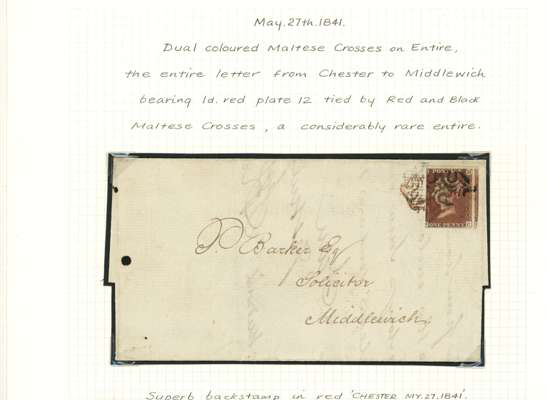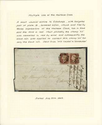 1841 1d Red-brown. Pair of entires both tied by red & black MC's. The first bearing a single Pl.12. (SG8, MC) tied by a red MC and Black MC's. the second entire bearing a horizontal pair of Pl.18's (SG9, KJ-KK) with KJ being tied by a red MC and several black MC's with KK tied by a single black MC. An unusual pair of covers with the red MC's struck in error.