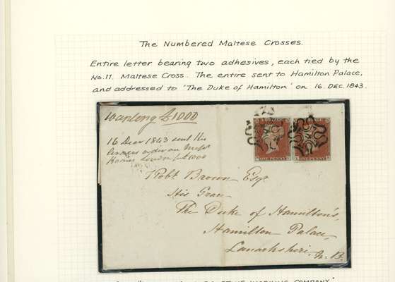 1843 Entire letter bearing two 1841 1d Red-brown (NC & LB) each tied by London No.11. MC's. Sent from the London Marble & Stone Working Company, Westminster to The Duke of Hamilton, Hamilton Place. An attractive cover. SG 8.