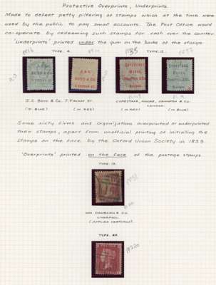C.1858-68 Protective underprints, overprints. Attractive group of six used under/overprints consisting of J & C Boyd PP16 (Pl.13), PP14 (Pl.121)- Copestake, Moore, Crampton & Co PP35 (Pl.113), PP37 (Pl.9)- WM Dawbarn & Co, Liverpool PP81 (Pl.110)- O.U.S. PP220 (SG40, C10). Cat £695. (6)