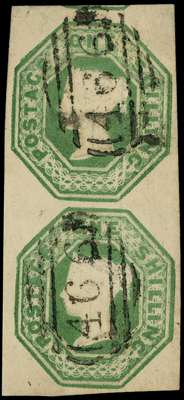 1854 1s green (Die W.W.2). Very fine four margin vertical pair, each stamp neatly cancelled by a Liverpool ‘466’ numeral. Scarce. SG55.