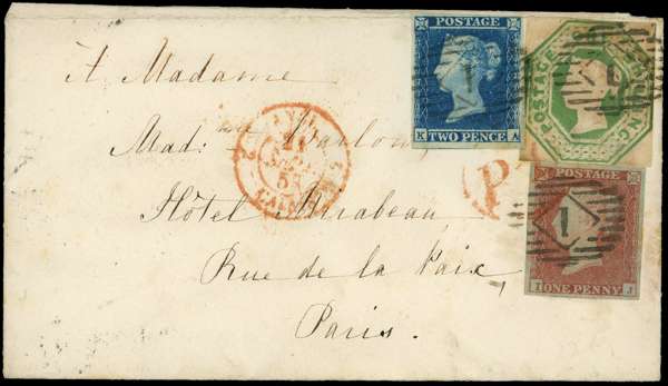 1853 Overseas mail. Fine 1s3d double rate envelope from London to Paris prepaid by a four margin 1d red-brown (SG8), four margin 2d blue Pl.4 (SG14) and a 1s pale green (SG54), all tied by London Chief Office ‘1’ numerals and a red ‘PD’ (Paid to Destination) handstamp. London, Calais and Paris datestamps for SP.20+21.1853. Attractive and scarce combination franking. SG8,14,54