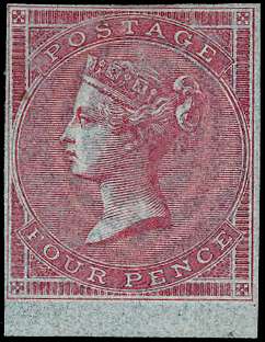 1855 4d carmine Pl.2 (Wmk. Small Garter). Very fine large part o.g. imperforate bottom marginal imprimatur printed on highly glazed deeply blued paper. SG62var Cat. £8500.