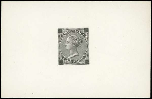 1871 4d Die proof. Very fine example with uncleared corner squares and plate numbers, printed in black on matt card for the 1871 London International Exhibition. SG93var Cat £2000