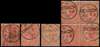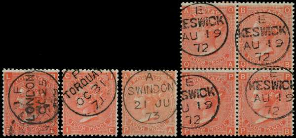 1869-73 4d vermilion Pl’s. 11-14. Very fine selection including a Pl.11 single, Pl.12 single and a block of four, Pl.13 single all with cds cancellations and Pl.14 single on clean cover to Italy. SG94