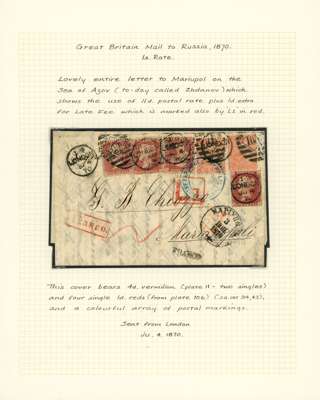1870 Overseas mail. Fine entire from London to Mariupol, Ukraine pre-paid 1s equating to the 11d per ½oz rate plus a 1d late fee payment by two 4d vermilion pl.11 and four 1d rose-red pl.106, cancelled by London Chief Office ‘106’ duplexes for JU.4.1870. Mariupol arrival cds below adhesives for the 3rd (Julian calendar), Moscow receiving cds on reverse for MY.28.1870 (Julian calendar). Scarce destination item. SG43,94