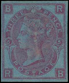 1868 3d rose Pl.5. Fine unused imperforate four margin example lettered RB printed on Dr Perkins deeply blued security paper. Scarce. Spec. J30b. Cat. £3600.