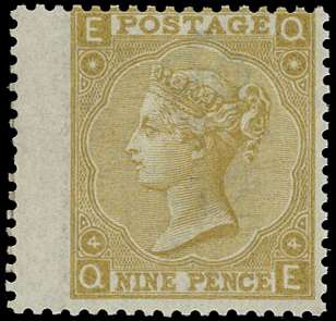 1867 9d straw Pl.4. Very fine unused o.g. left hand wing margin example lettered QE. Superb colour. SG110 Cat. 2500.