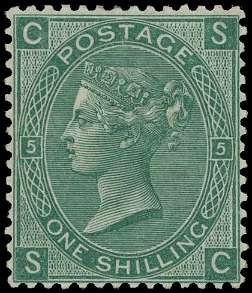 1871 1s green Pl.5. Very fine unused large part o.g. example lettered SC. Well centred with excellent colour. SG117 Cat. £800