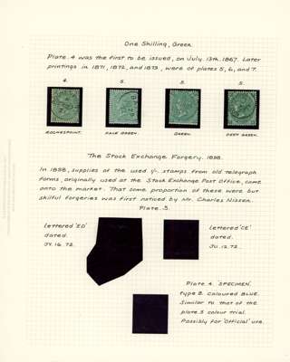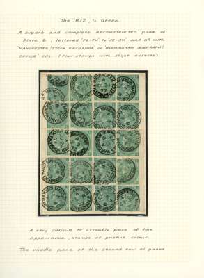1867-73 1s green (shades) Pl’s. 4-7. Very fine selection of 35 examples all with cds cancellations including a Pl.4 single. Pl.5 3 singles, horizontal marginal pair with sheet inscription and a right hand wing margin block of four, Pl.6 three singles and a reconstructed pane of 20, two Pl.7 singles including one marginal with sheet inscription. SG115,117