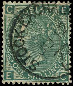 1872 1s green Pl.5 ‘Stock Exchange Forgery’.