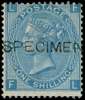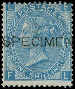 1867 1s Green Pl.4. Unused no gum example lettered FL in a greenish-blue colour similar to the plate 5 colour trials, overprinted ‘SPECIMEN’ type 8. Unusual. Sold on its merits. SG117var