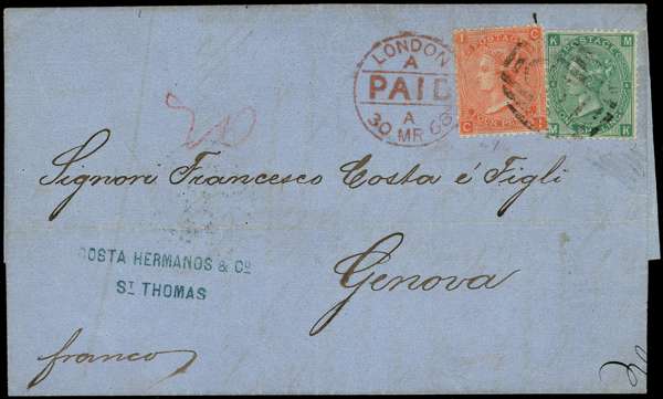 1868 GB Used Abroad. Very fine cover from St. Thomas, Danish West Indies to Genoa, Italy via London and France, prepaid at the 1s4d per ½oz rate by a 1s green Pl.4 (Wmk. spray) and a 4d vermilion pl.9, tied by a single C51 type 4 numeral and a red London ‘PAID’ cds for MR.30.1868. St. Thomas and Genova datestamps on reverse for MR.14.1868 and AP.1.1868 respectively. SGZ10,Z29