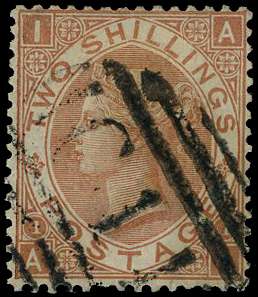 1880 2s brown Pl.1. Fine used example lettered AI, cancelled by a BPO Guayaquil (Ecuador) type 4 ‘C41’ numeral. Scarce. SGZ30 Cat. £2500.