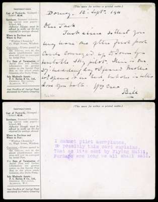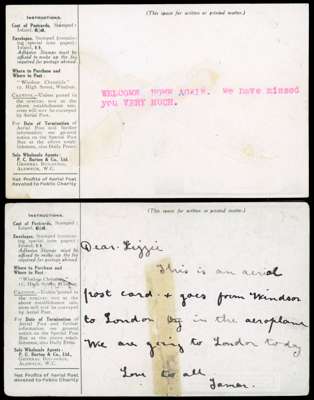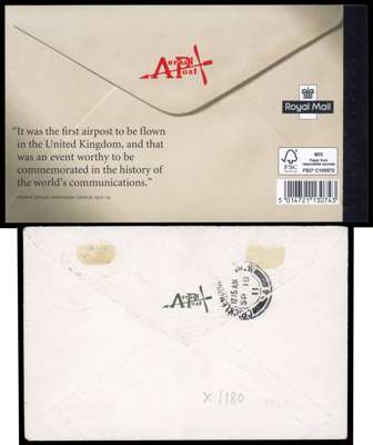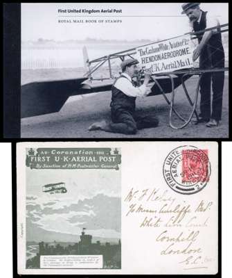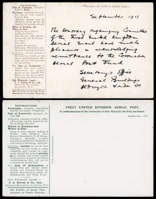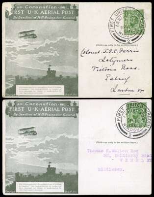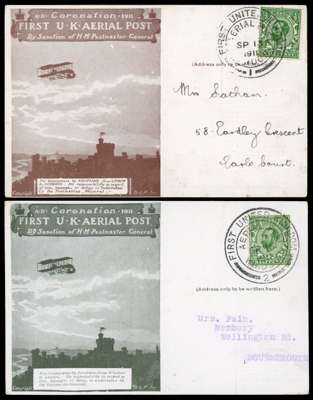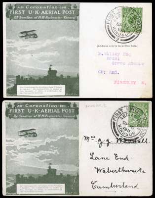 FIRST UK AERIAL POST: 1911 selection comprising postcards London to Windsor in brown and Windsor to London in green (5) and envelope in green, fair to very fine. Also centenary anniversary booklet. (8)