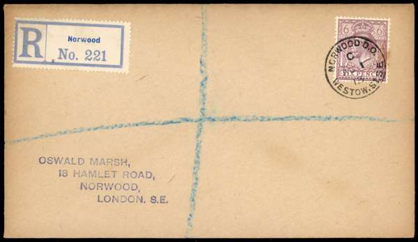 1913 6d Dull purple. Very fine used example tied to a plain 'Marsh' registered envelope by a crisp Norwood D.O. Westow St. S.E. cds for AU.1.1913, the first day of issue. Attractive and very rare. SG384. Booth (31i) Cat £3,350.