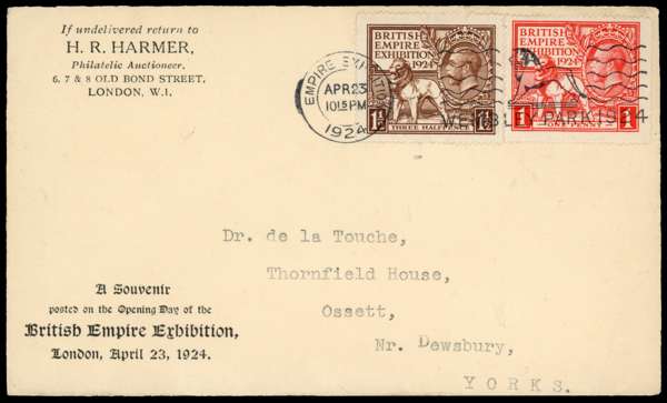 1924 British Empire Exhibition. Very fine Harmer envelope sent to Dewsbury, Yorkshire bearing a 1924 British Empire exhibition set of two (SG430/1) neatly tied by a single strike of the Empire Exhibition slogan machine cancel for the first day of issue AP.23.1924. Cat £450.