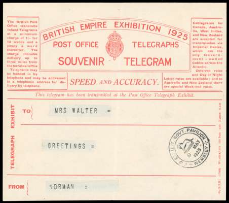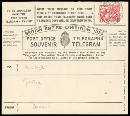 1925 1d British Empire Exhibition. A spectacular British Empire Exhibition souvenir telegram, bearing a 1d (SG432) tied by the ''P.O. EXHIBIT. GOVT. PAVILION/WEMBLEY/9 MAY/1925'' first day handstamp offered with the corresponding telegram receipt without adhesive but also cancelled with the same first day cds. Remarkable quality and a very rare item. SG432. Booth Cat £2,850.