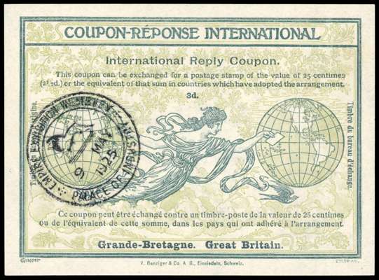 1925 3d UPU International reply coupon. A fresh UPU international reply coupon cancelled at left by an Empire Exhibition Wembley Palace of Industry datestamp for the first day of the exhibition MY.9.1925. Most unusual and a wonderful example with this rare cancellation.