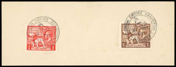 1925 British Empire Exhibition. Very fine large piece folded centrally bearing a 1d at left cancelled by a British Empire Exhibition Wembley datestamp for the first day if issue/exhibition MY.9.1925 with a 1½d at right cancelled by the same cancellation and used on the last day of the exhibition OC.31.1925. A spectacular combination.