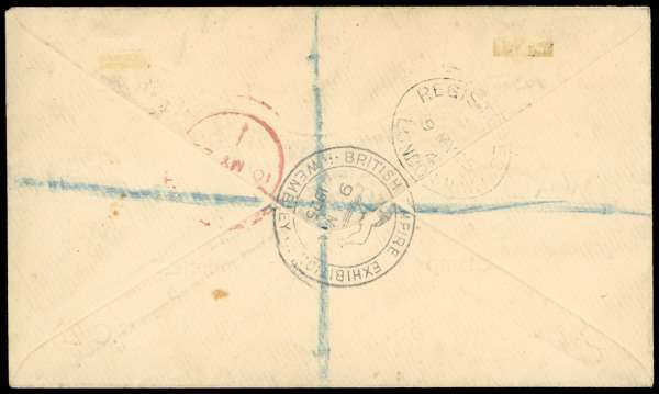 1925 British Empire Exhibition. Very fine registered envelope bearing a block of four 1½d (SG433) tied by a British Empire Exhibition Wembley handstamp for the first day of issue MY.9.1925. with a British Empire Exhibition No.44 Registered label at bottom left. Backstamped by another B.E.E. datstamp on reverse for the first day with a registered oval datestamp alongside and a red hooded London Registered datestamp for the following day. Scarce first day cover.