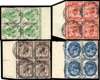 1929 ½d-2½d Postal Union Congress. Very fine used set of four marginal blocks of four each cancelled by Torphichen cds' for MY.8.1929. These were most probably cancelled pre-release by accident. Scarce & unusual.
