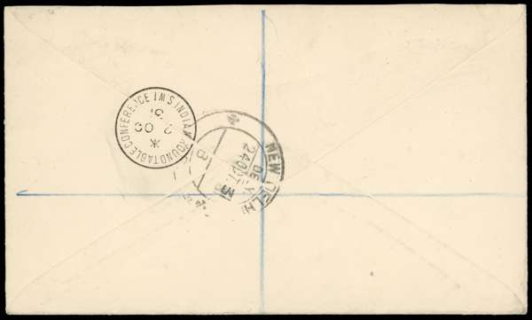 1931 Indian Round Table Conference (Second Session September 1931 - December 1931) registered envelope addressed to New Delhi, India bearing KGV ½d and 2d (horizontal pair) each cancelled by very neat Indian Round Table Conference S.W.1. cds for 2.OC.1931 and ‘USE THE/AIR MAIL/TO/INDIA/ALSO/PERSIA, IRAQ & EGYPT’ label at lower left, backstamped with additional Conference cds and New Delhi arrival for 24 OCT 24 ds. Scarce and most attractive Indian Round Table Conference item. Mahatma Gandhi was in attendance as the Indian Congress Representative.