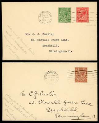 1934 Harrison printings first day cover, Two fine envelopes the first bearing a ½d & 1d from the 2s & 3s Booklets and the second bearing a 1½d value from the same source. Both tied by Birmingham machine cancellations for MR.8.1934 for the first day of issue of the Harrison printings issued in stamp booklets from March 1934. Very scarce and unusual.