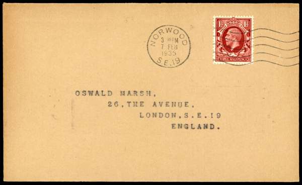1935 1½d Red-brown (Small format 17.9 x 21.7mm). Very fine used example neatly tied to an “Oswald Marsh“ envelope by a Norwood machine cancel for the first day of issue FE.7.1935. A very rare first day cover. SG441var. Booth Spec. 41w, Cat £1500.
