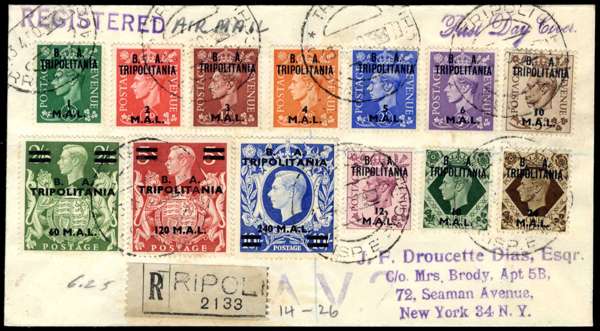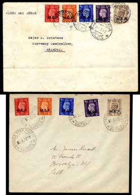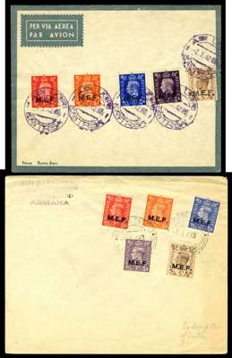 1942-50 selection of covers with Middle East Forces including: 1942 opt Type M1 set of 5 on unaddressed cover with Adi Ugri violet first day cds for 2.3.42 and set of 5 on cover to Brooklyn, New York with Asmara first day cds for 2.3.42, 1942 opt Type M2/M2a set of 5 on cover to Nairobi with Asmara Ferr. Pacchi first day cds for 2.3.42, 1943-47 opt Type M3 set to 5d on unaddressed cover tied by Asmara Centro first day cds for 1.1.43 and set to 2s6d on cover to Sudan tied by Asmara Centro first day cds for 1.1.43 and set to 2s6d used in a folder tied by Rodi cds for 28.12.46, Somalia 1943-46 set to 1s on unaddressed cover tied by Mogadiscio first dat cds for 15.1.43, Tripolitania 1950 set of 13 on registered cover to New York tied by Tripoli cds for 13.4.50. Fair to fine and scarce. (7)