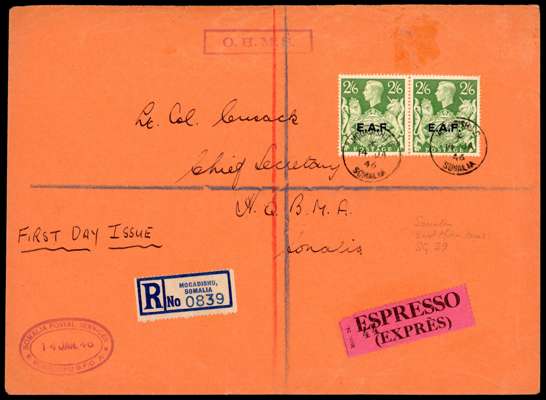 1946 (14 Jan) 2s6d yellow-green, pair, franked on registered express envelope used on the first day of issue. Fine and scarce. SG 59