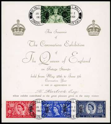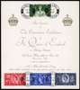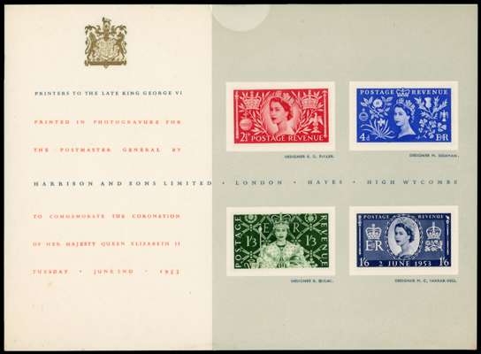 1953 Coronation. Spectacular set of four affixed to a coronation exhibition presentation card tied by pre-release 50 Pall Mall, London. S.W.1. cds' for JU.2.1953. Very Rare Exhibition Card. offered with an unused set of four in a presentation wallet.