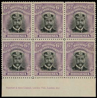1913-7 6d Head Die II, perf 14. Unmounted o.g. lower marginal block of six with imprint, the lower middle stamp with a small foxed path on reverse, facially fine. SG 217, AH 2