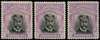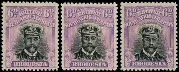 1913-7 6d Head Die II, perf 14. Three fine o.g. Plate 4, State 2 examples in black and pinkish mauve, deep mauve and reddish purple; respectively with R5/8 smear flaw, snowstorm and wing collar tip flaws and wing collar tip flaw only. SG 228 vars, AH 12 (B1-3)