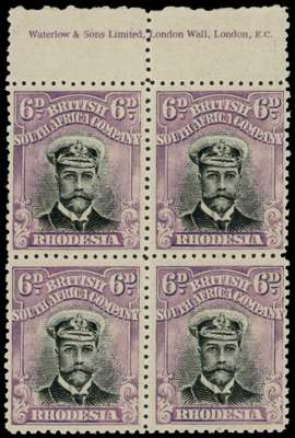 1913-7 6d Head Die II, perf 14. Mint block of four in (pale) grey-black and reddish lilac, top, unmounted o.g. marginal block of four with full imprint. From Plate 5 State 1, showing the characteristic absence of doubled coat line tips. Endorsed in pencil (on reverse of selvedge) 'FEIRA 6/5/20'. Ex Gibbs, Baillie and Steinberg. SG 228 group, AH 13(A)