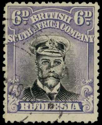 1922-4 6d Head Die IIIB, perf 14, white paper. Used example in black and lilac with light CDS, showing R4/1 large RHODESIA; very scarce used. SG 295a (single stamp), AH 25 Var